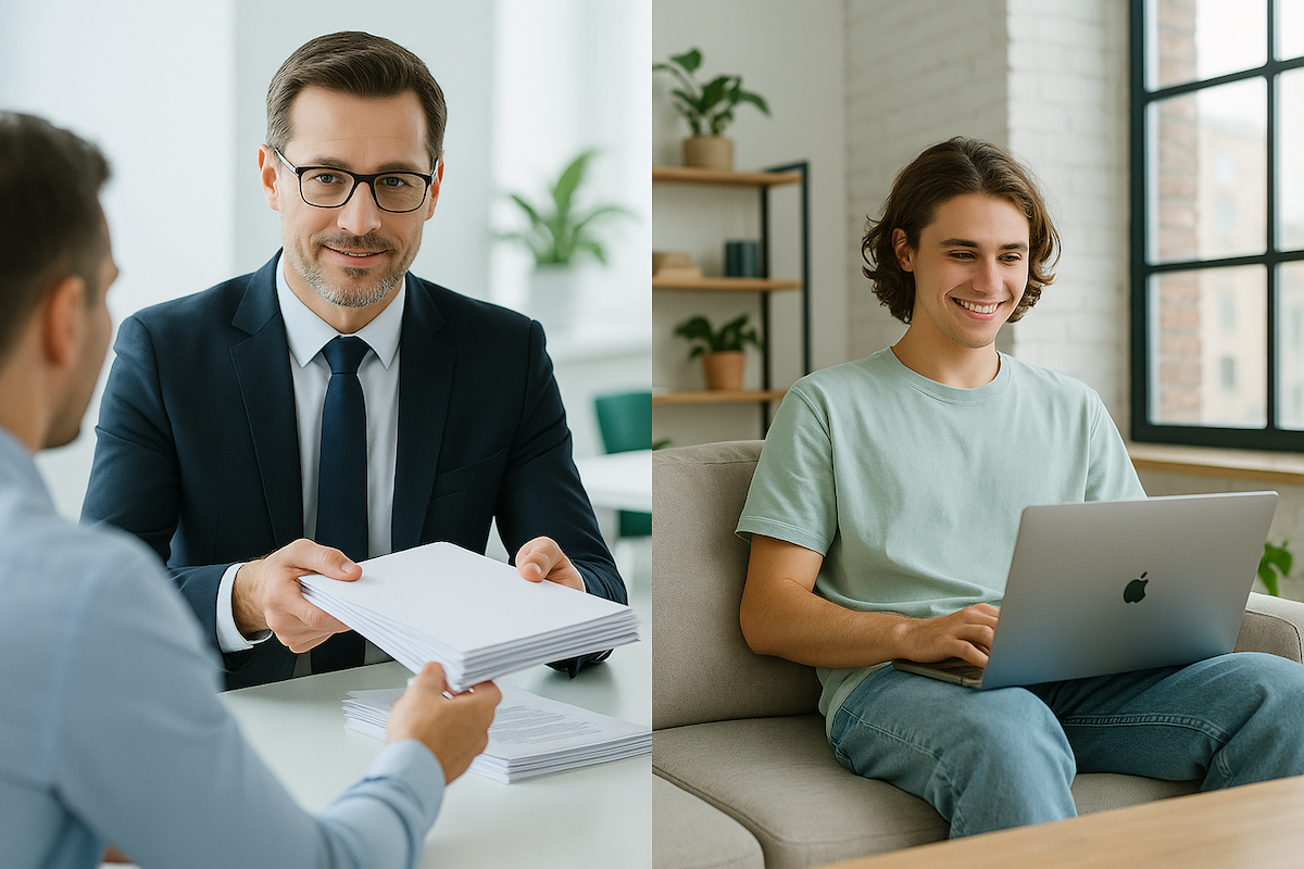 Zeitaufwand für dich | Geringer bei Textarbeit, dafür viele Abstimmungen / Korrekturschleifen. | Niedrig dank geführtem Prozess; Entwürfe in Stunden statt Wochen. |